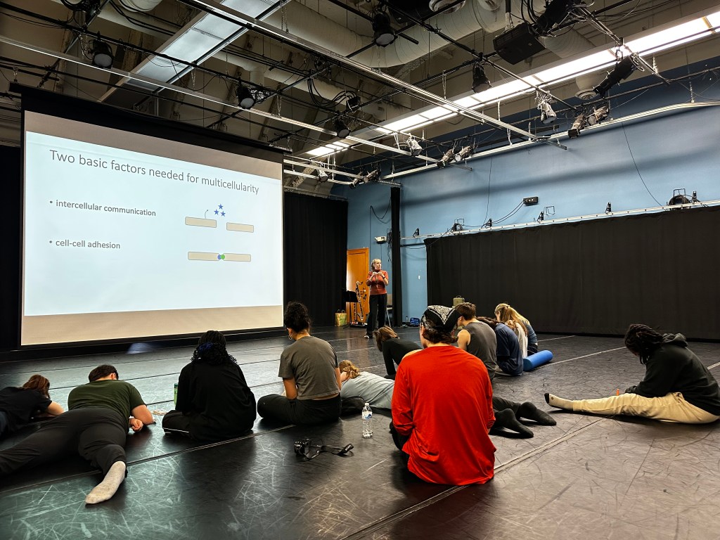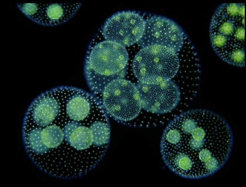 Auto-ethnography in/aside, I began to explore the natural world outside of the context of my HIV diagnosis through observation and question-asking. A teacher at the school I work at, Hunter Jones, introduced me to the Volvox Algae and the question that has immense interest to microbiologists: How did single celled life become multicellular? I realized that the question itself is derived from scientific inquiry, and, it offers such a vibrant metaphor for community organizing through somatically inclusive dance. As a high school biology teacher, I knew nothing about this topic and began researching rote knowledge online. For instance: the volvox algae retains its individuality yet together can survive predation, has enhanced mobility, and includes division of labor for survivability. Although fictive, I began to envision the dancers arriving at conclusions about multicellularity for themselves and to explore the topic as a place of departure. I also envisioned the dancers and my choreography assisting a scientist in arriving at new knowledge about the origins of multicellular behavior. How could I guide the dancers there? And the scientist? What questions would I ask? What choreography would I make? What discoveries could be made?